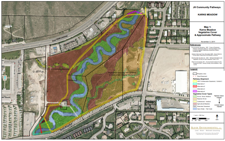 Karns Meadow is a 41-acre parcel of largely undeveloped land lying between West Jackson (a mixed-use area), downtown Jackson (a commercial area) and South Jackson (residential areas and at the foot of the Snow King ridge). The Karns family sold the property to the Town of Jackson in eight separate parcels between 2003 and 2009, and partnered with the Jackson Hole Land Trust on conservation easements that define the conservation values and permitted uses for each parcel. The purchase agreement and easements allow for a number of physical improvements including a pathway around the perimeter of the meadow, a natural surface equestrian trail, a fishing access platform, parking area, bathroom facilities and picnic shelters for park users, trail lighting, park/pathway signage, a public bus stop, a public parking lot and/or parking garage, as well as the development of three residential housing lots (the attached Map 1 is a 2011 exhibit that shows the Karns Meadow area, vegetative cover type, and various pathway alignment alternatives, including the alignment initially identified in the easements (town of Jackson Town Council Agenda Documentation, Feb. 5th, 2018).