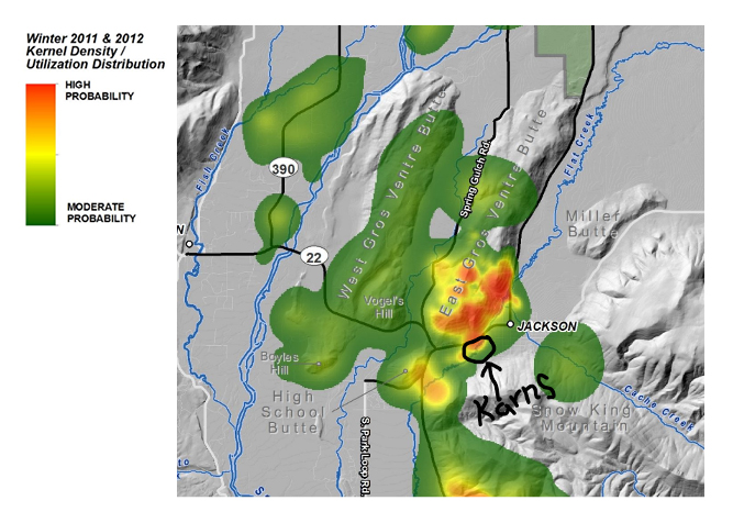 Mule deer make extensive use of this area in the winter and for seasonal migrations, in conjunction with the south-facing hillside of East Gros Ventre Butte to the north (Riginos et al., 2013, Figure 2). A study of mule deer movements and habitat use in 2010-2012 showed the immense value of Karns meadow and south facing slopes on East Gros Ventre Butte. Karns meadow is in the heart of mule deer winter range in Jackson and is used daily by mule deer in the winter.