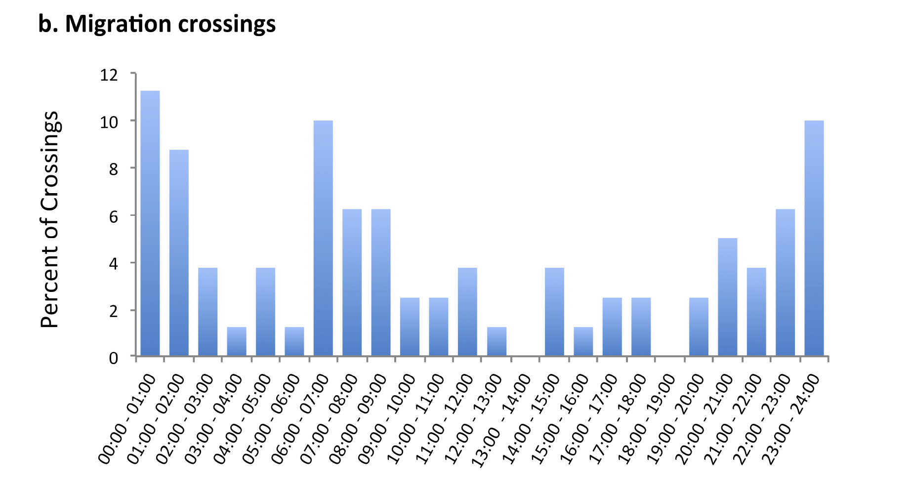 The time of the day is also important, with many more crossing occurring between 6 at night and 6 in the morning. Shown below is Mule Deer crossing times from a study of 40 gps collared mule deer in Jackson Hole (Riginos, C.R. et al. Mule Deer (Odocoileus hemionus) Movement and Habitat Use Patterns in Relation to Roadways in Northwest Wyoming. Final report to Wyoming Department of Transportation.)