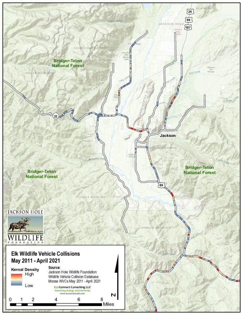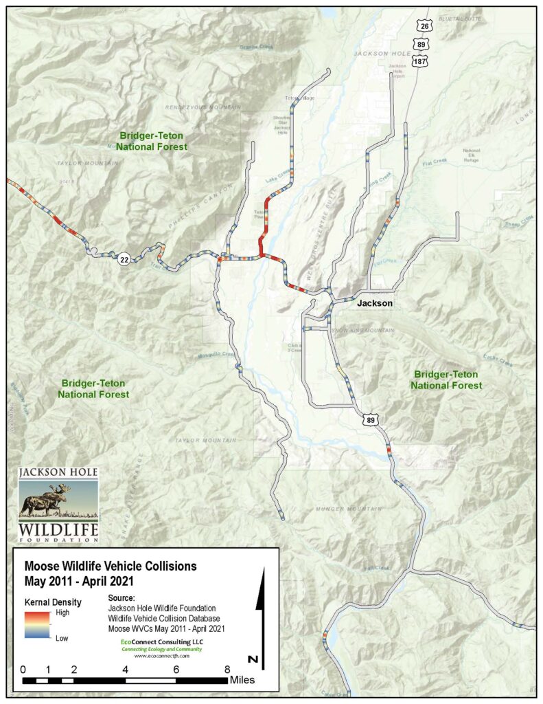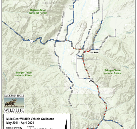 Below are maps of wildlife collision hotspots from 2011-2021 by species — Moose, Elk, and Mule Deer: (Source: Jackson Hole Wildlife Foundation)