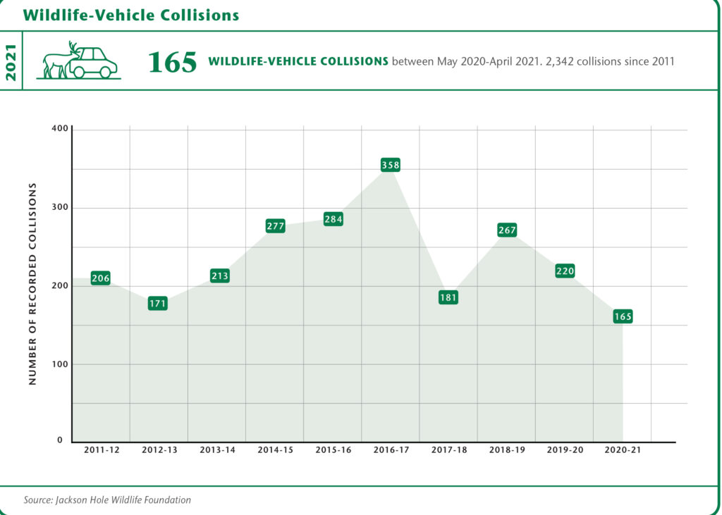 You can see from the figure above that wildlife-vehicle collisions have been on the decline in Teton County for the past three years for which we have data (2018-2021). This is a great trajectory for our coexistence efforts, which include reduced nighttime speed limits, wildlife fencing, wildlife underpasses, road signage, community education, and other mitigation efforts. Though it might be too early to celebrate this decline, as this data does not include this last winter, which we know was highly deadly for ungulates on our roads (due to unusually deep low-elevation snowpack this last winter).
