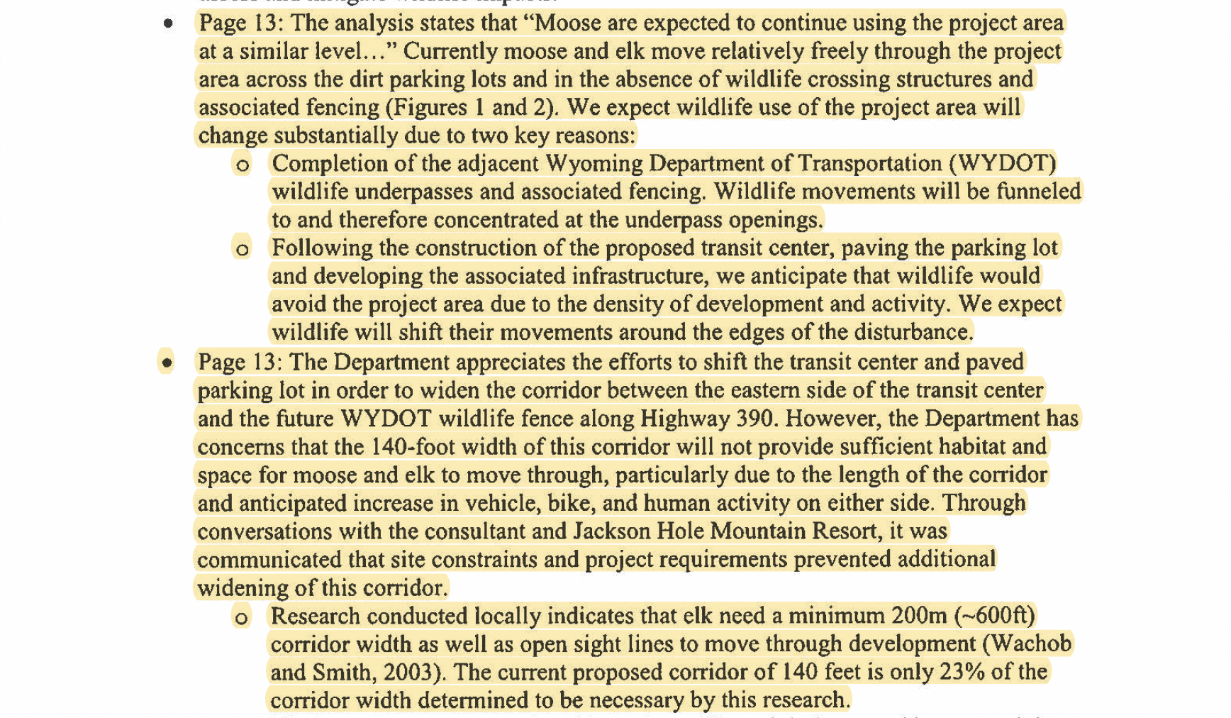 KEY ISSUE – The planned wildlife corridors are insufficient – they are too narrow. Wyoming Game and Fish has stated that 600-foot wide (200-meter) wildlife movement corridors are necessary to ensure the success of the wildlife underpasses at Stilson. WGFD further states that the 140-foot width of the planned corridor “will not provide sufficient habitat and space for moose and elk to move through…” See an excerpt from their June 25, 2023, letter to the Teton County Planning Department below. You can read the full letter here.