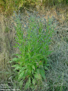 Houndstongue’s deep magenta flowers are small, 5-petaled, and grow along wiry stalks. These flowers produce 4 prickly burs that stick like Velcro to your clothes and transport the seeds for next year’s crop of houndstoungue. This plant has a biennial growth habit, meaning it has a two-year life cycle – the first year it just grows leaves, the second year it grows larger, flowers, makes seeds, and dies. Wear gloves, it is toxic to animals and people when ingested.