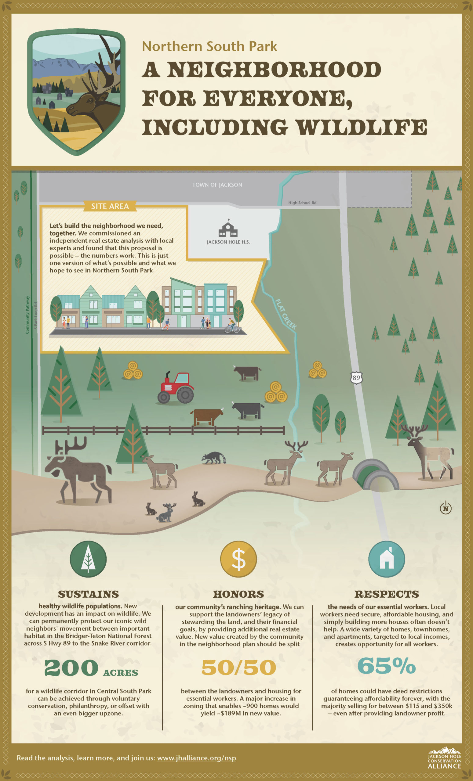 Northern South Park is about who we are as a community – what we do or don’t do there will forever change our town. If we get it wrong, we run the real risk of more community members working here but raising their families somewhere else, and incrementally losing the wildlife we love. Getting this right looks like honoring our ranching heritage, respecting the needs of our essential workers, and sustaining healthy wildlife populations. We have a choice in Northern South Park. Help make it the right one by emailing commissioners@tetoncountywy.gov and sending a comment directly to planning staff using the project website with your support for our vision. And email kyle@jhalliance.org for other ways to build a neighborhood for everyone, including wildlife, sustainable transportation …we need you to make this a reality!