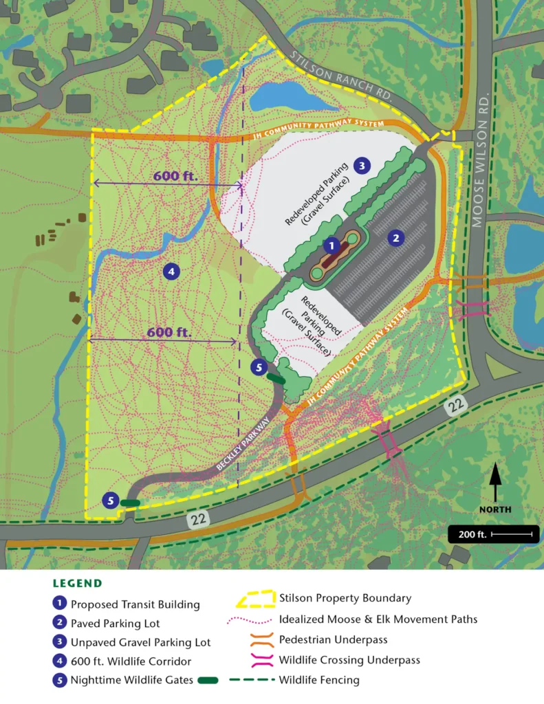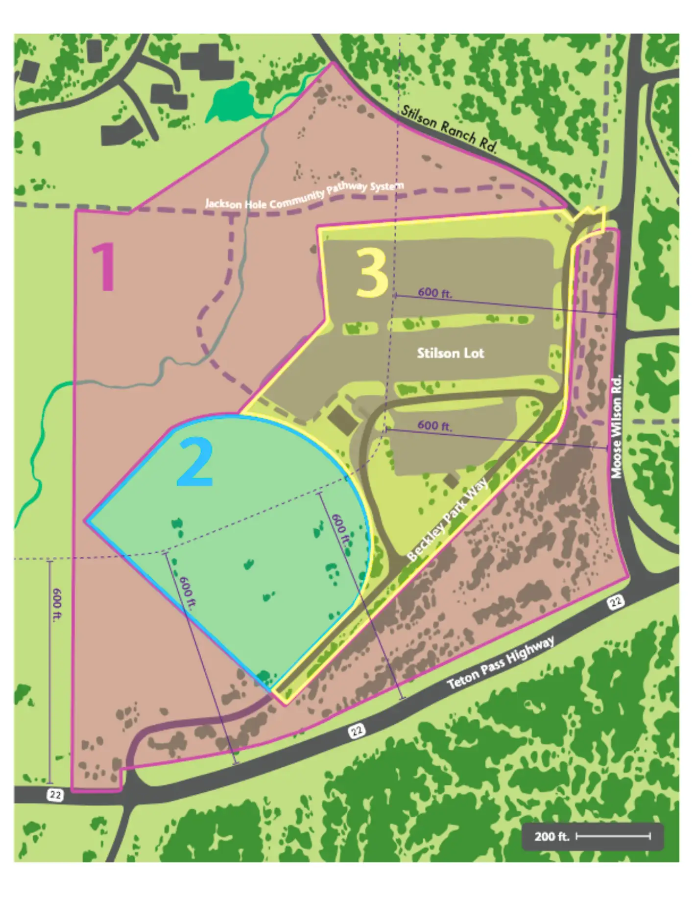 Teton County Commissioners approved the development of a transit center on the 15.18-acre Lot 3. Currently this space contains a gravel parking area with 882 spaces, a cell phone tower and some small utility buildings. A transit center will support community efforts to improve transportation and limit congestion through our scenic corridor. Pavement should be minimized as it is slippery to wildlife and stops ground water permeability. Lighting should maintain dark skies and not be directed towards the wildlife corridors.