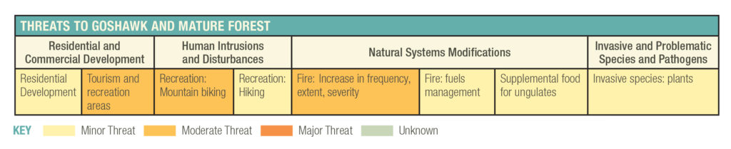 In the Caribou-Targhee National Forest, 68% of the Goshawk nesting area is mature timber and it is likely that in the Jackson Hole area, most nesting areas contain more than 50% mature timber. More frequent wildfires could lead to a more homogenized forest ecosystem with less old-growth timber, crucial for Goshawk nesting areas.