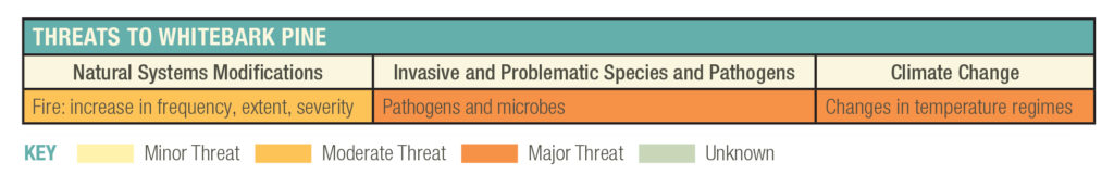 Their main threats include wildfires, native mountain pine beetles, and white pine blister rust, an introduced fungal disease from Asia. In the Greater Yellowstone Ecosystem, roughly 50% of Whitebark pine has been lost or compromised.